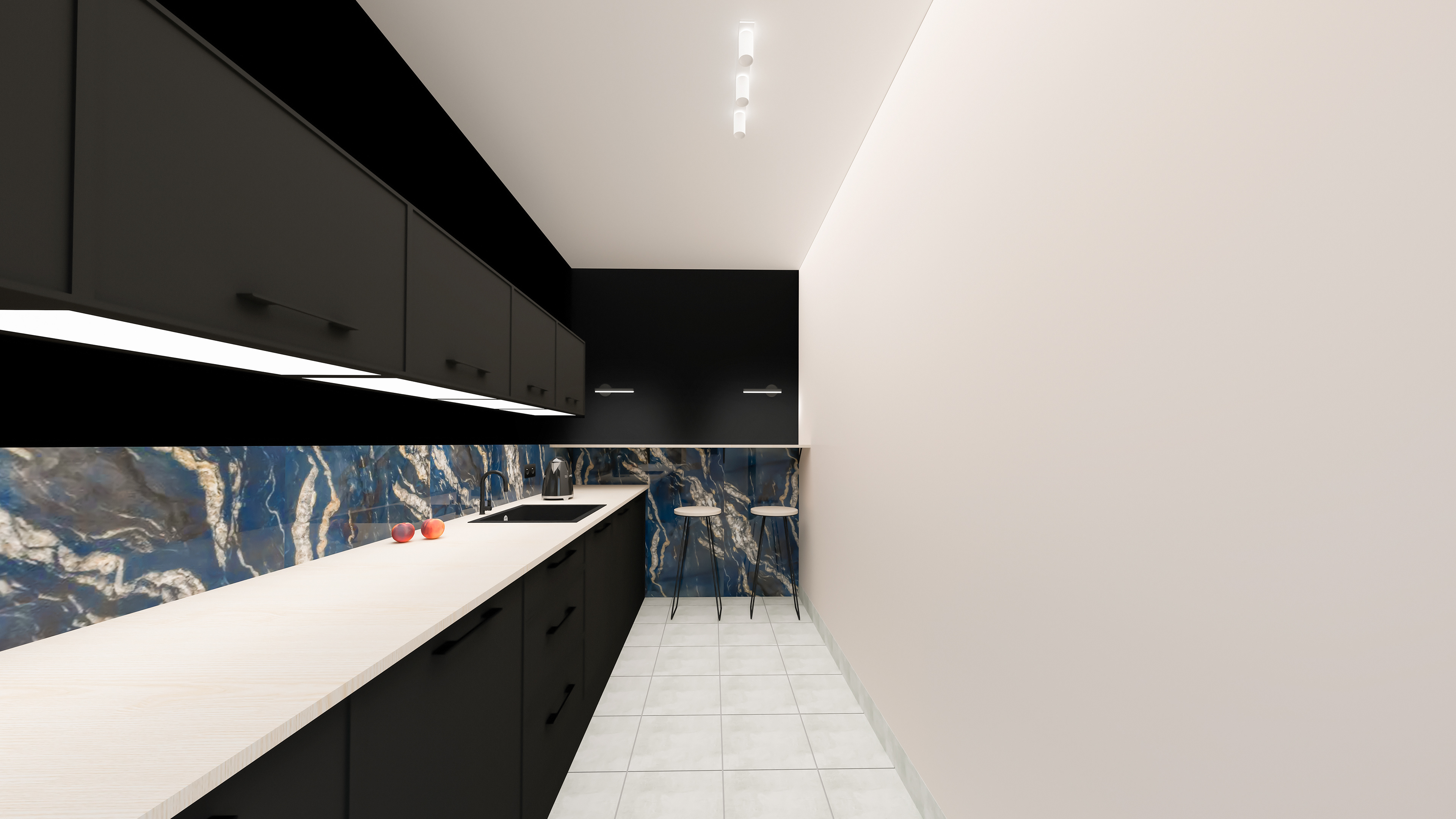 Koncepcyjny projekt kuchni biurowej dla przestrzeni zajmowanej przez ponad 50 pracowników oraz gości. Barwne i wzorzyste marmurowe płytki ścienne zostały skontrastowane z matowymi, czarnymi frontami meblowymi oraz stonowaną kolorystyką ścian i podłogi. Do charakterystycznego wzoru glazury dobrany został bielony sosnowy blat, który tonuje całość i sprawia , że jest ona bardziej dostępna dla użytkownika. Całość projektu została ulokowana na powierzchni niecałych 10 metrów kw.